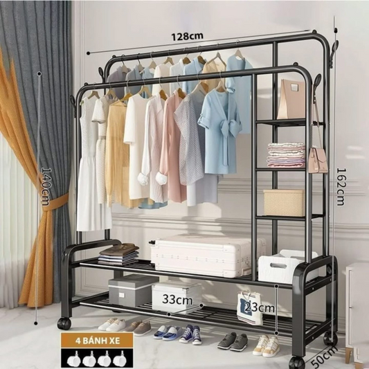 Dual Pole Movable Clothes Rack – Wardrobe Stand With Shelves & Coat Storage